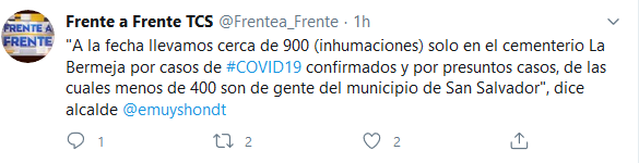 «Llevamos cerca de 900 solo en el cementerio de La Bermeja por casos de covid-19, entre confirmados y por casos sospechosos”, detalló el edil en una entrevista de TCS. De ese total, menos de 400 son de ciudadanos de más de “100 municipios” del país, ya que la alcaldía ha brindado apoyo, según dijo Muyshondt.