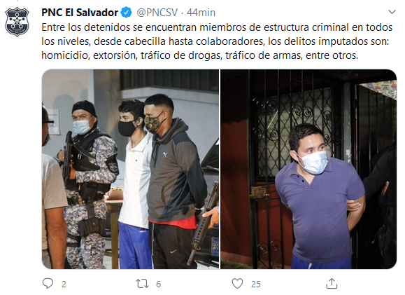 El fiscal general de la República, Raúl Melera, informó este sábado que en la madrugada han capturado a más de 20 miembros de la Mara Salvatrucha por delitos como homicidio, tráfico de drogas y armas, en San Salvador.