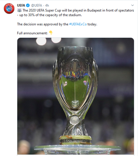 La UEFA acordó que la Supercopa de Europa, disputada por el Bayern de Múnich y el Sevilla, a jugarse el 24 de septiembre, tendrá un número de espectadores del 30% de la capacidad del Puskás Aréna, en Budapest, Hungría.