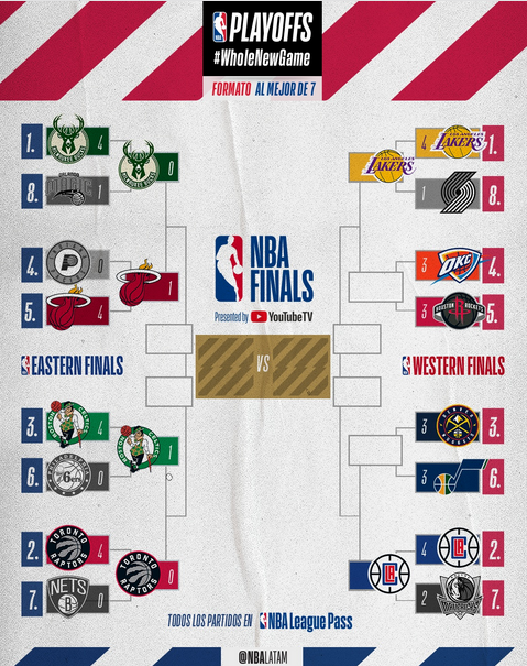 La NBA sigue buscando a los representantes de conferencia para la disputa por el gran título, luego de una atípica temporada en la burbuja de Orlando. La conferencia Este ya inició semifinales mientras el Oeste aún disputa dos boletos, ya esperan los Lakers y Clippers, ambos de Los Ángeles.