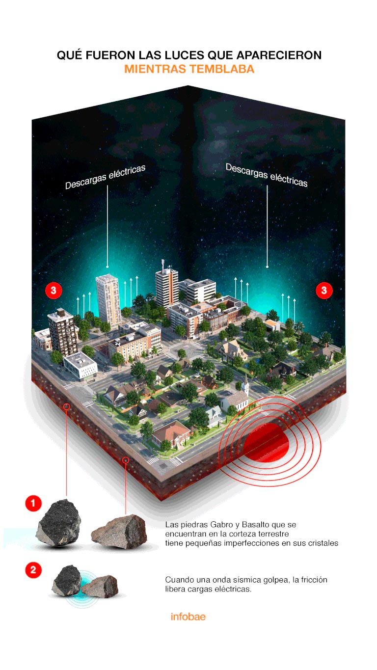 Rocas de la corteza terrestre como el basalto y el gabro tienen pequeñas imperfecciones en sus cristales. Cuando una onda sísmica golpea la fricción libera cargas eléctricas de estas rocas.
