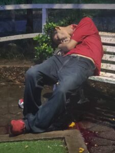 El cuerpo fue hallado sobre una banca, con evidentes lesiones provocadas por arma blanca. La víctima vestía camiseta roja, pantalón jeans azul y calzado deportivo blanco. Cerca del lugar se encontraron dos latas de cerveza, lo que hace presumir que el ataque ocurrió alrededor de la 1:00 a. m.